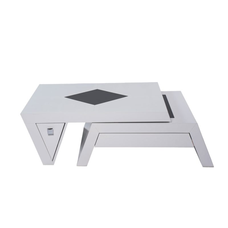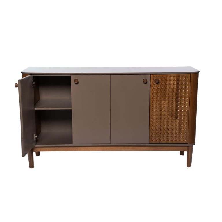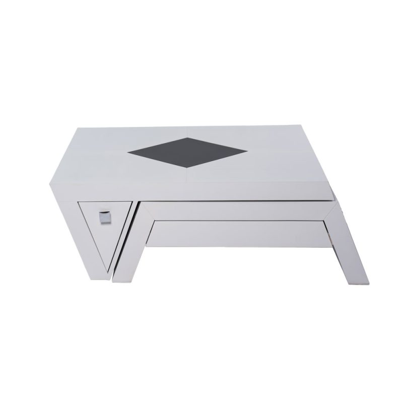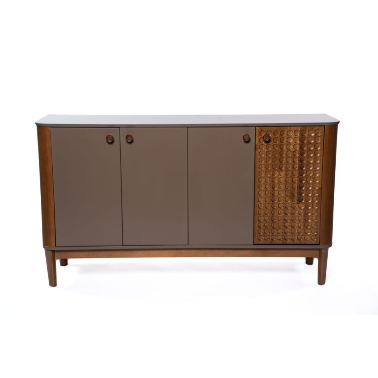 - Finitura bianca lucida con dettagli ondulati in legno.