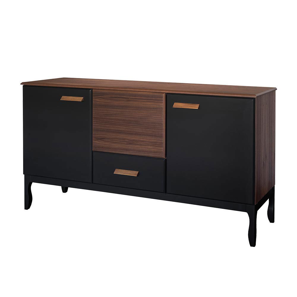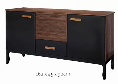 Realizzata in pregiato legno massello di faggio, la credenza Giulio si distingue per la sua struttura solida, le venature naturali del legno e la finitura nera opaca. Le sue dimensioni generose – 1620 mm (L) x 450 mm (P) x 900 mm (A) – offrono un ampio spazio contenitivo, perfetto per organizzare stoviglie, tessili o oggetti quotidiani.